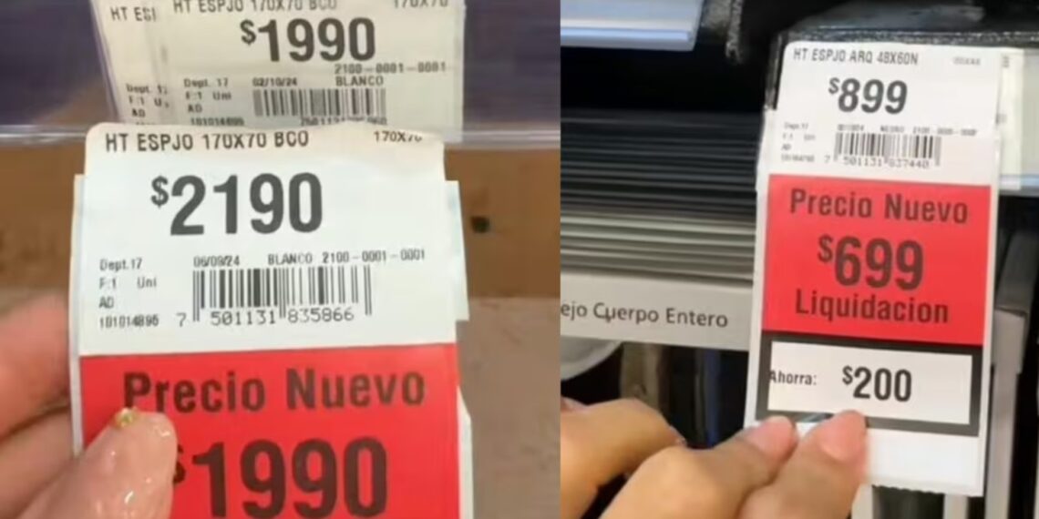 La mujer continua levantando etiquetas y descubre que todas las ofertas de ese pasillo son falsas. Por ejemplo, un espejo prometía bajar de 2 mil 190 pesos a 1 mil 990 pesos, pero su precio bajo la etiqueta siempre fue de 1 mil 990 pesos.