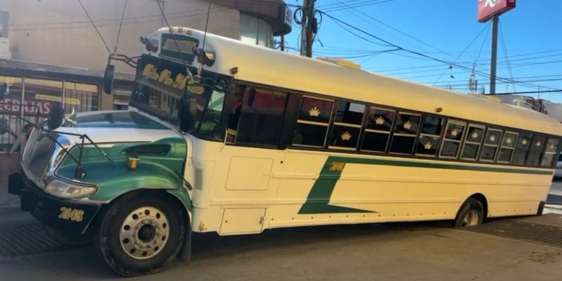 Ciudad Juárez, Chih. – Un camión de transporte de personal quedó atorado en pleno cruce de las calles Mina y Ahumada, generando un importante congestionamiento vehicular en la zona.