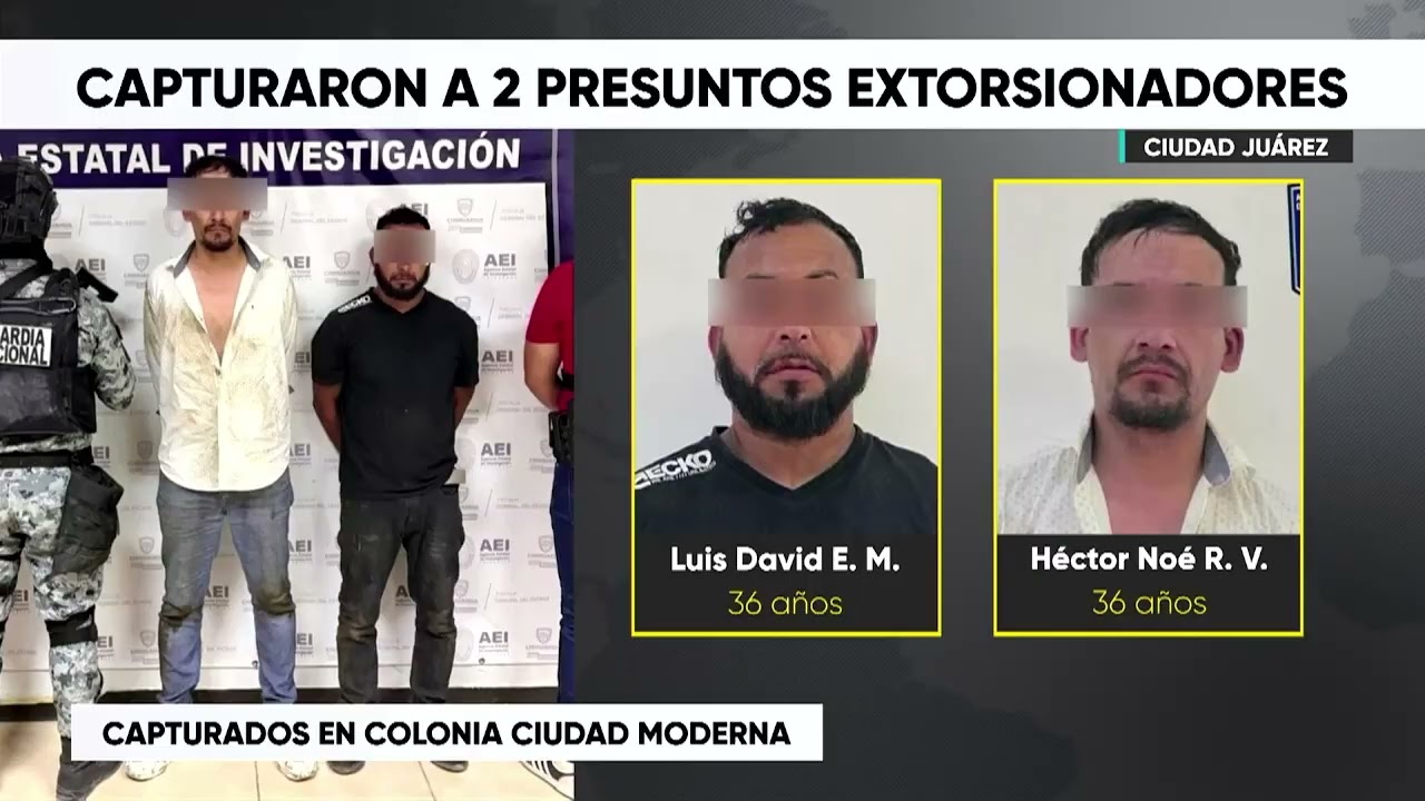 Ciudad Juárez, Chihuahua.- Para fortalecer el combate al delito de extorsión, la Fiscalía General del Estado (FGE) efectuó la captura de dos presuntos extorsionadores en la colonia Ciudad Moderna. Los detenidos, identificados como Luis David E. M. y Héctor Noel R. V., ambos de 36 años, fueron sorprendidos en términos de flagrancia durante un operativo estratégico de las autoridades investigadoras.