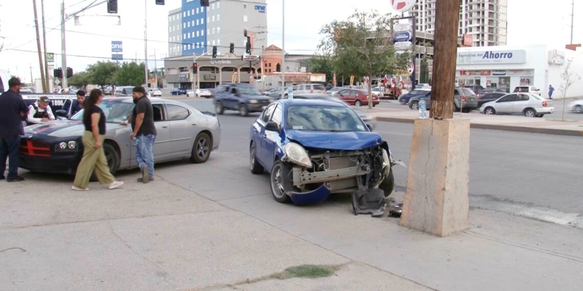 Ciudad Juárez, Chih.– Un aparatoso accidente se registró en el cruce de las avenidas Plutarco Elías Calles y Ejército Nacional, donde un Nissan Sentra azul terminó incrustado contra un poste tras ser chocado por un Dodge Challenger.