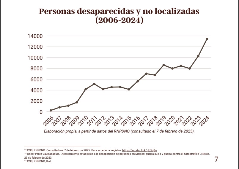 El documento advierte que la cifra de personas desaparecidas ha crecido de forma sostenida en los últimos años, mientras que las instituciones encargadas de investigar estos casos se encuentran rebasadas y sin capacidad suficiente para responder a la magnitud del problema. Tan solo en 2024 se registraron 12 mil 759 nuevos casos, convirtiéndose en el año con más desapariciones desde que existe registro oficial.