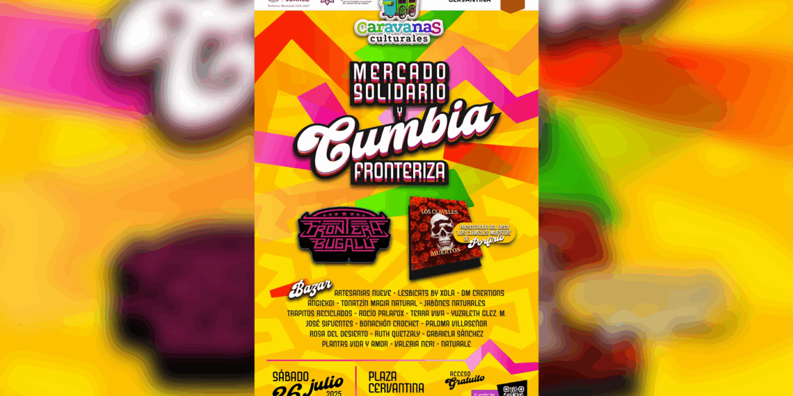Ciudad Juárez, Chih. – Este sábado 26 de julio a partir de las 5:00 de la tarde, la Plaza Cervantina se llenará de música, arte y sabor con la llegada de la Caravana Cultural “Mercado Solidario y Cumbia Fronteriza”, un programa impulsado por el Instituto para la Cultura del Municipio de Juárez (IPACULT).
