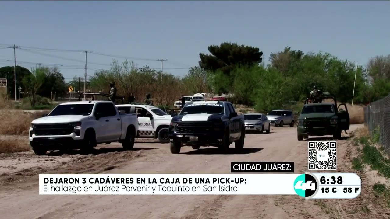 Ciudad Juarez, Chih.- La nota reporta el hallazgo de tres hombres sin vida abandonados en la caja de una camioneta Nissan Frontier roja con placas fronterizas, ocurrido este jueves alrededor del mediodía en el poblado de San Isidro. El vehículo fue localizado en la intersección de la carretera Juárez a Porvenir y la calle Clemente Toquinto, en una zona cercana a un carril de caballos que fue acordonada por las autoridades para asegurar la evidencia. Como una situación peculiar durante el resguardo de la escena, una grúa trasladó al mismo punto otra camioneta, una Blazer con manchas de sangre que había sido asegurada previamente en la colonia Barrio Azul (cerca de la entrada a Zaragoza). Aunque no se ha determinado formalmente la conexión entre ambos eventos, la movilización de este segundo vehículo hacia el lugar del hallazgo de los cadáveres generó gran atención durante las labores de investigación en el Valle de Juárez.