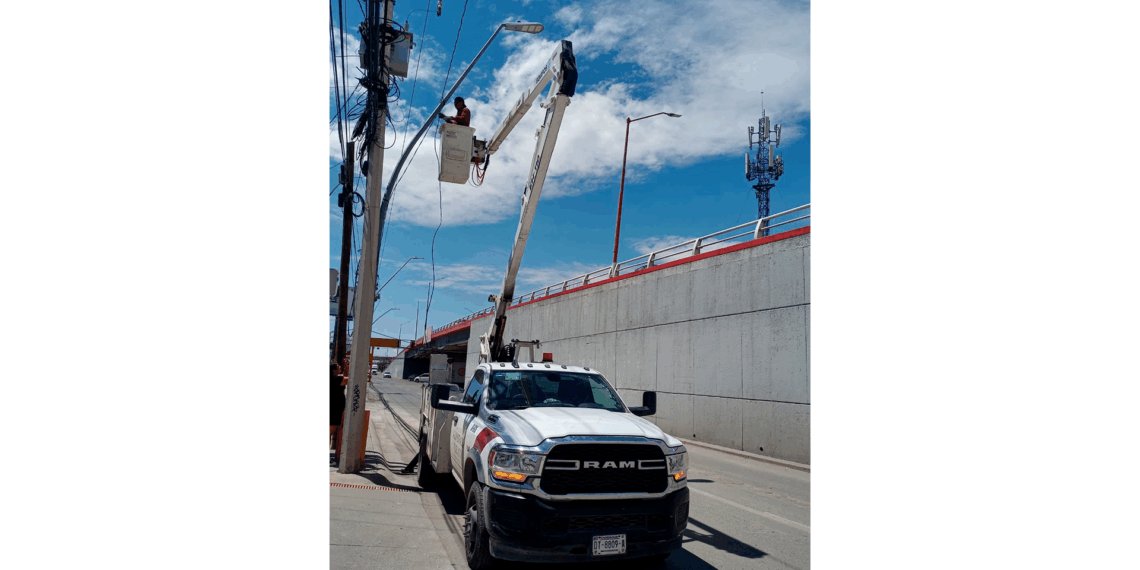 Ciudad Juárez, Chih.- Una empresa particular realiza este lunes maniobras para colocar una pantalla publicitaria en un anuncio panorámico ubicado sobre Paseo Triunfo de la República, a unos metros de una conocida farmacia. Debido a la operación con grúa y personal técnico, el tramo vial permanece cerrado.