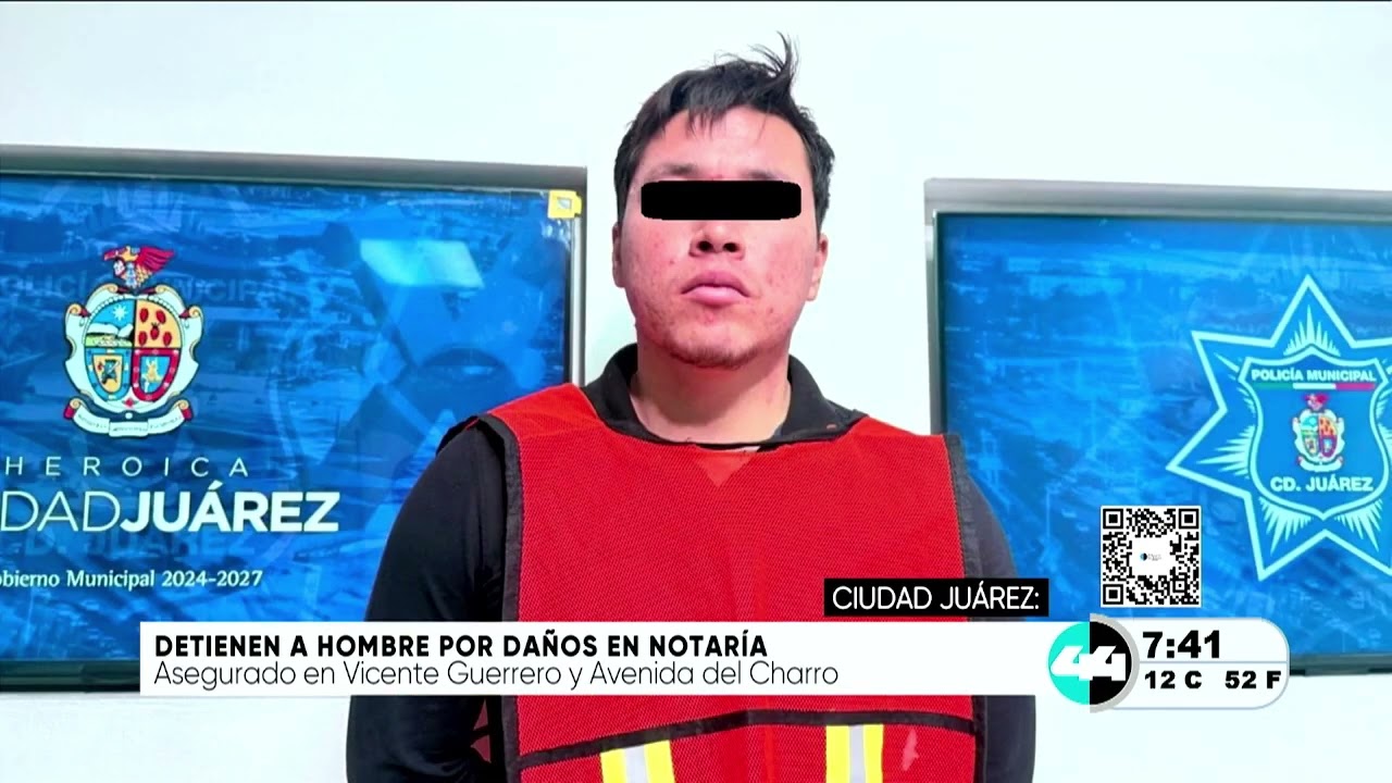 Ciudad Juarez, Chihuahua.- Elementos de la Secretaría de Seguridad Pública Municipal, adscritos al Distrito Universidad, realizaron la detención de un hombre de 27 años identificado como Christopher O. R. El arresto se produjo tras un reporte que alertaba sobre la presencia de una persona sospechosa en el interior de una notaría pública, donde se registraron daños materiales para lograr el acceso.