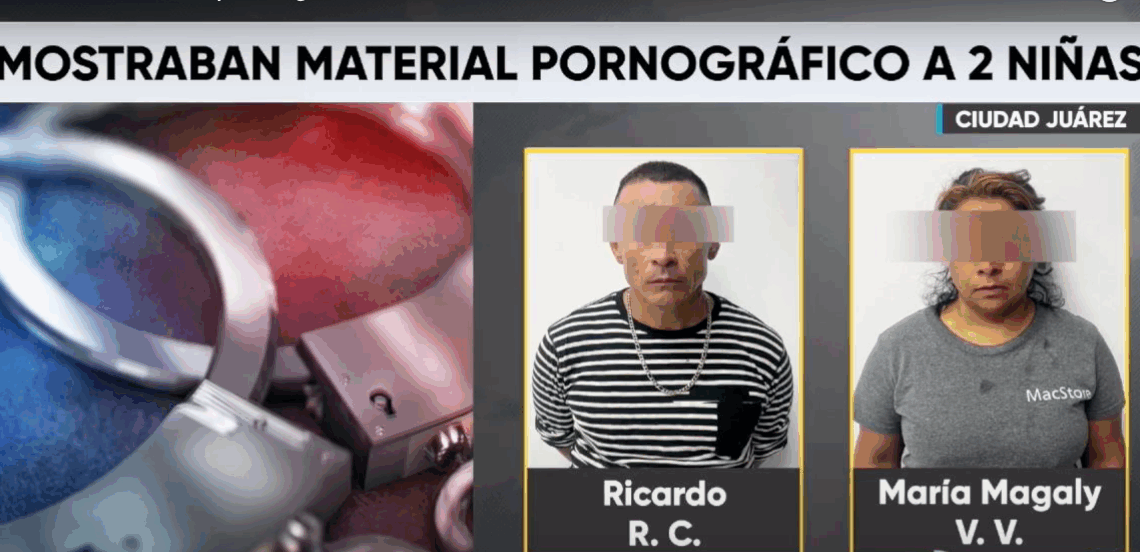 Ciudad Juárez, Chihuahua.- La Fiscalía Especializada en Atención a Mujeres Víctimas del Delito por Razones de Género y de la Familia informó sobre la detención en flagrancia de Ricardo R. y María Magali U. B., acusados de mostrar material pornográfico a dos niñas de tan solo 1 y 4 años de edad.