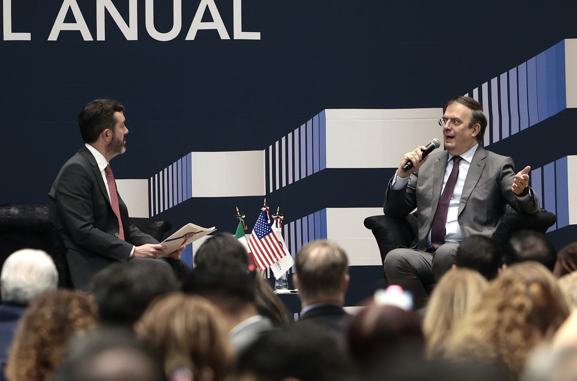 Ciudad de México.- El secretario de Economía Marcelo Ebrard (d) y el presidente de la American Society of México, Larry Rubin participan en la 85 asamblea anual de la American Society of México este miércoles, en Ciudad de México (México). Tanto el sector empresarial estadounidense en México como el Gobierno mexicano consideraron este miércoles poco probable la imposición de aranceles por parte de Estados Unidos, pese a las amenazas lanzadas por el presidente, Donald Trump, en su retorno a la Casa Blanca.