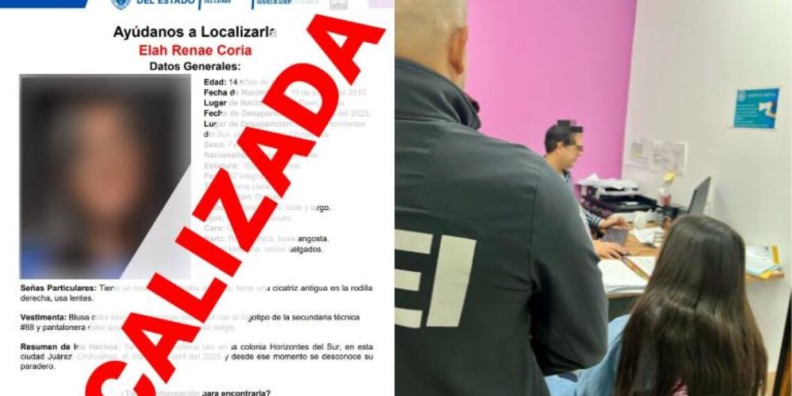 Ciudad Juárez, Chihuahua. La Fiscalía Especializada en Atención a Mujeres Víctimas del Delito por Razones de Género y a la Familia informó la localización con vida de Elah, una menor de 14 años identificada con las iniciales E.R.C., originaria de El Paso, Texas, quien fue reportada como desaparecida desde el 8 de abril de 2025 en la colonia Horizontes del Sur, en esta ciudad fronteriza.