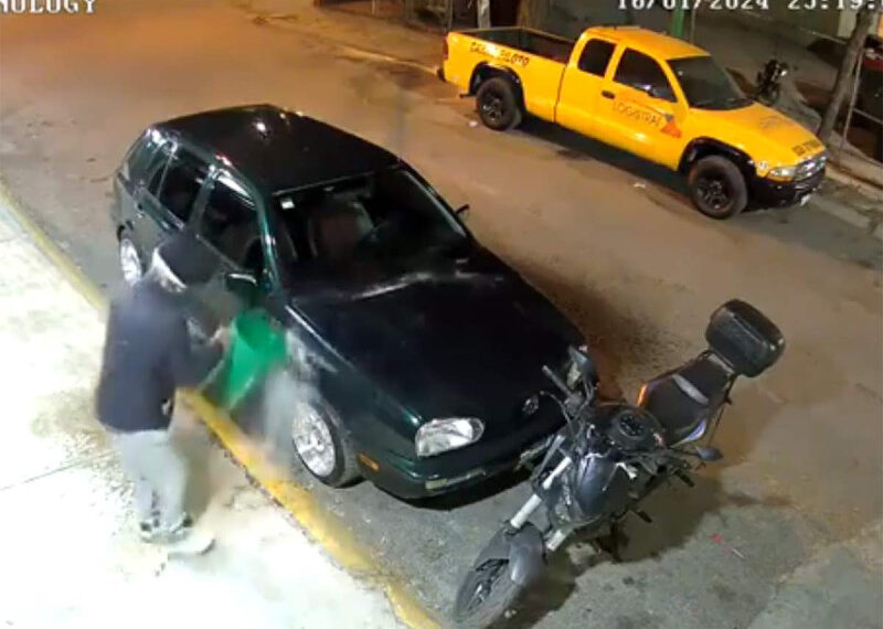 En las imágenes que se volvieron virales se ve al sujeto que rocía un bidón con gasolina sobre un vehículo de color oscuro que se encontraba estacionado en calles de la colonia Atlanta del citado municipio.