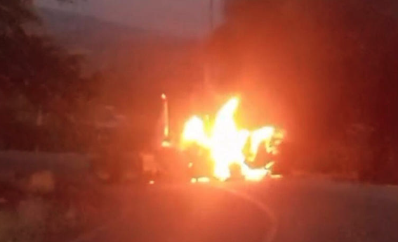 Michoacán, México.- Un camión de carga fue incendiado por un grupo ar.mado en la región de Tierra Caliente, luego de que el conductor fuera obligado a descender de la unidad, en hechos ocurridos sobre la carretera Buenavista-Los Reyes.