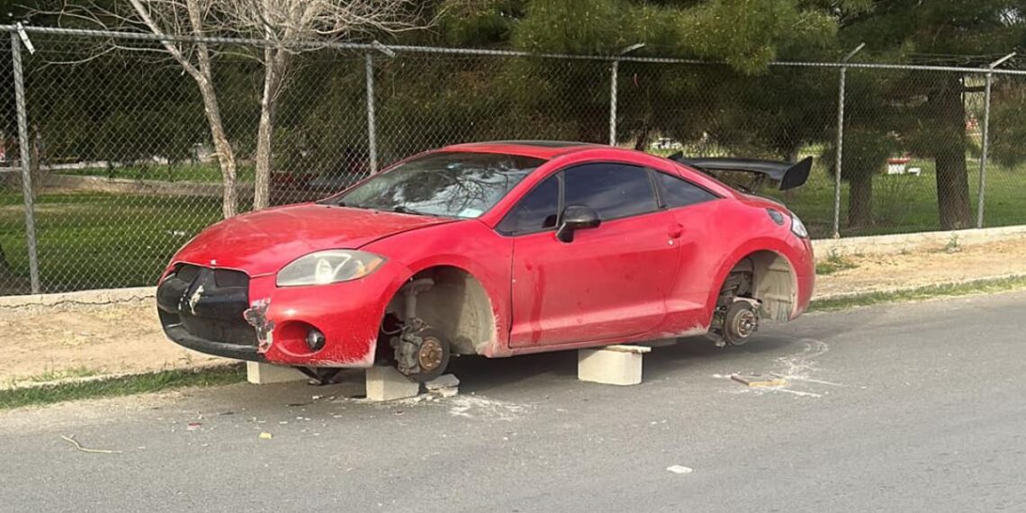 Ciudad Juárez.- Un vehículo Mitsubishi Eclipse rojo fue encontrado desvalijado y sin llantas, montado sobre bloques de concreto y madera en el parque El Chamizal, durante la madrugada.