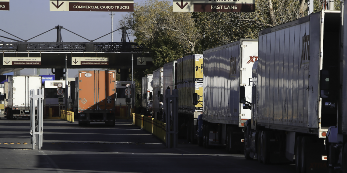 México.- Fotografía que muestra camiones de carga que cruzan este martes, hacia Estados Unidos en el Puente Internacional Zaragoza, en Ciudad Juárez, Chihuahua (México). Las recientes declaraciones del presidente de Estados Unidos, Donald Trump, en las que cuestiona el Tratado entre México, Estados Unidos y Canadá (T-MEC) han incrementado la incertidumbre económica en la frontera norte, donde especialistas y representantes empresariales advirtieron de un 2026 marcado por el freno a las inversiones y pérdida de empleos. EFE/ Luis Torres