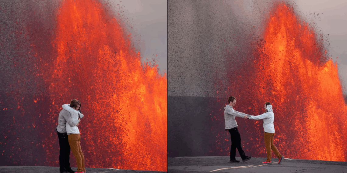 Las imágenes muestran a Marcus arrodillado, con total serenidad, mientras la lava incandescente asciende a pocos metros. El momento fue descrito por miles de usuarios como “una escena de película” o “el acto más romántico y arriesgado jamás visto”.