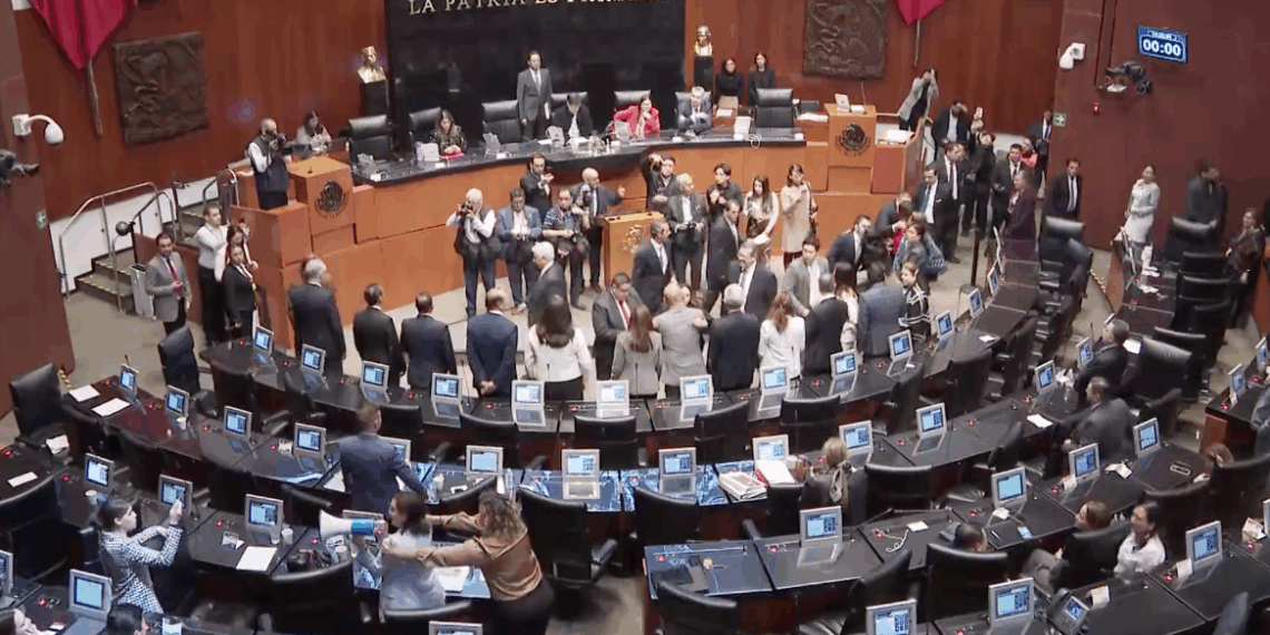 Téllez, que usaba un megáfono para llamar “corrupto” al funcionario, fue confrontada por Karina Ruiz (Morena) y Lilia Aguilar (PT), quienes intentaron quitarle el aparato. Ante su insistencia, la senadora subió a la Mesa Directiva, donde el forcejeo continuó hasta que Ruiz cortó el cable del megáfono con unas tijeras proporcionadas por la también morenista Malú Micher.