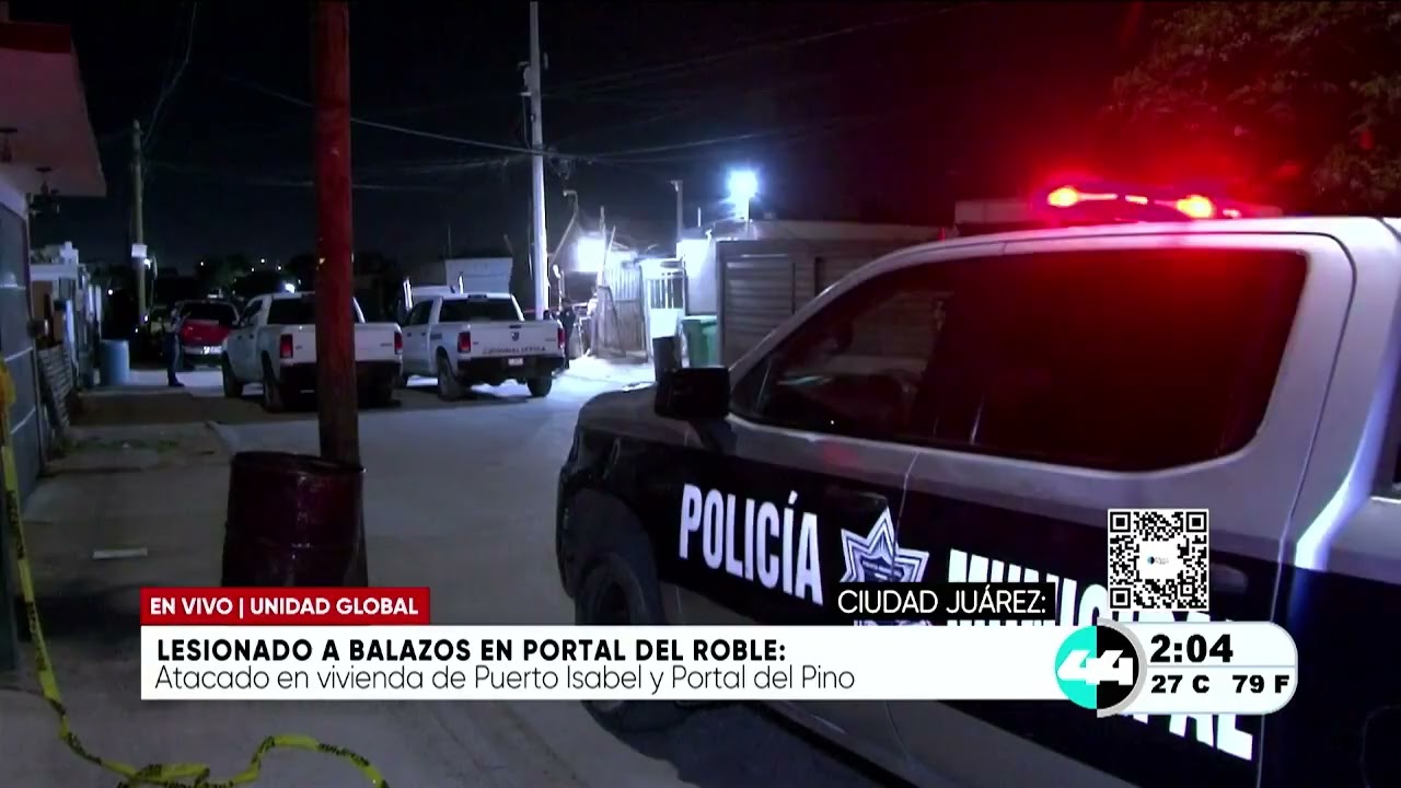 Ciudad Juárez, Chih.- Se confirmó que un hombre resultó herido a balazos en el cruce de las calles Portal del Pino y Portal de la Roca. Vecinos del sector alertaron a las autoridades tras escuchar múltiples detonaciones de arma de fuego. Elementos de la Secretaría de Seguridad Pública Municipal arribaron como primeros respondientes y localizaron a la víctima lesionada.