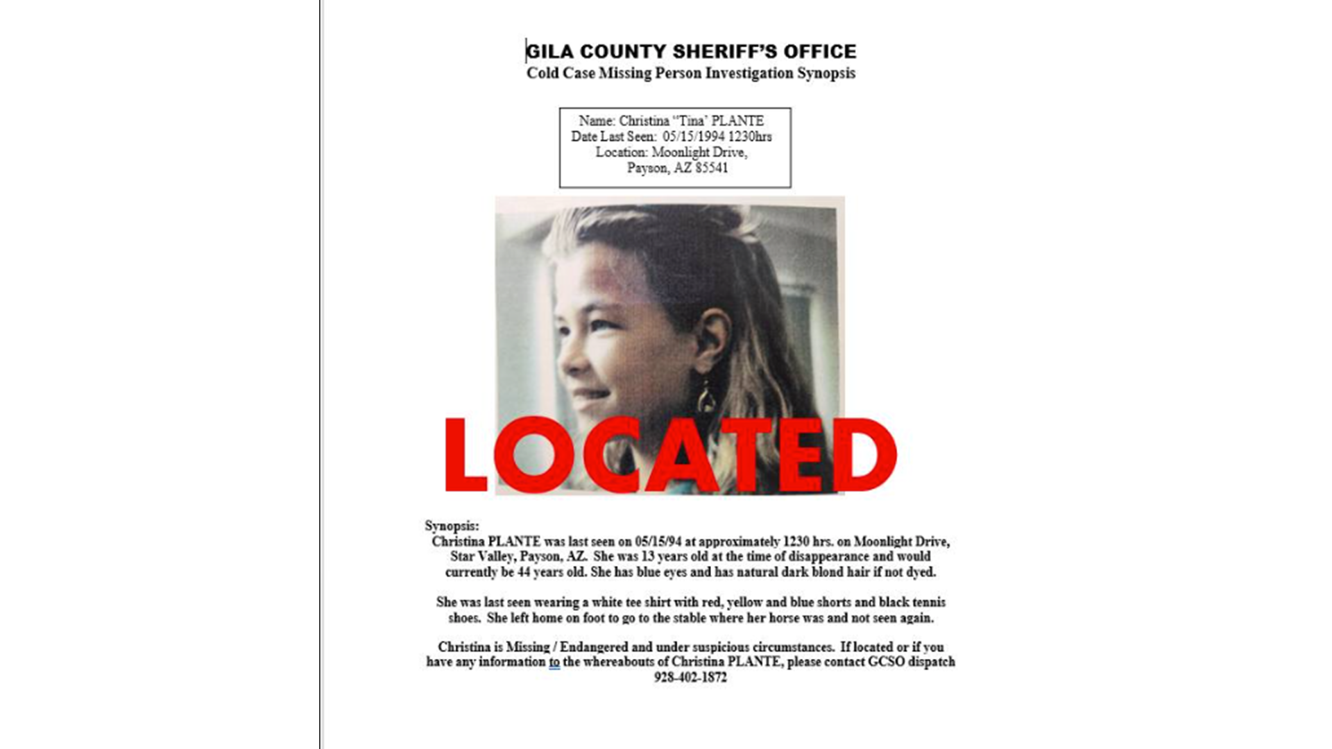 Phoenix, Arizona.- Después de más de tres décadas de incertidumbre, autoridades de Phoenix, Arizona, confirmaron que Christina Marie Plante, desaparecida en 1994, fue localizada con vida, resolviendo uno de los casos más prolongados de personas desaparecidas en la región.