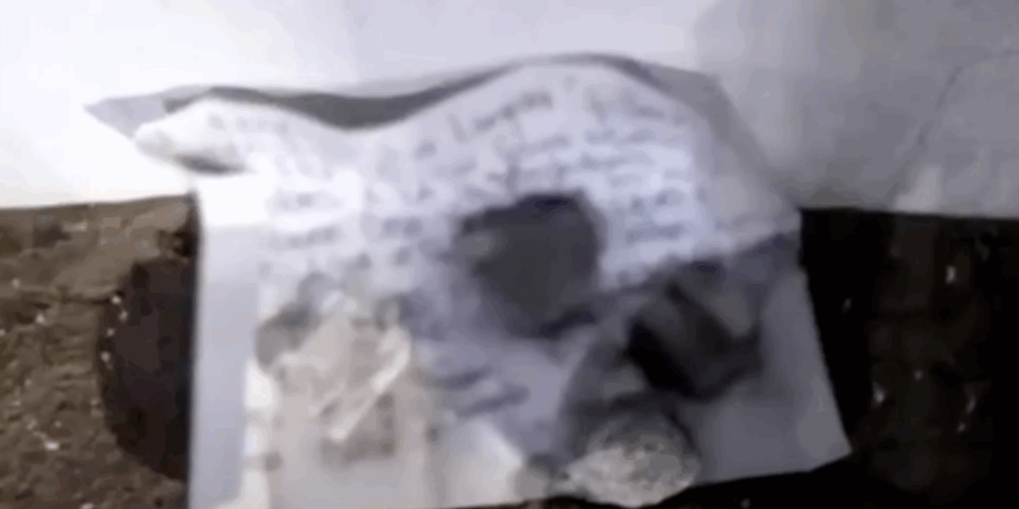 El mensaje fue localizado sobre el pavimento y, para evitar que se lo llevara el viento