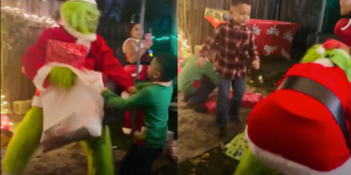 La reacción de los niños fue inmediata. Sorprendidos y molestos, varios pequeños se abalanzaron sobre el Grinch, arremetiendo física y verbalmente en defensa de sus presentes. Entre empujones, gritos y manotazos, uno de los niños incluso intentó quitarle la máscara al intruso para revelar su identidad, aunque sin éxito. El disfraz se mantuvo en su lugar mientras el protagonista del acto resistía el “contraataque” infantil.