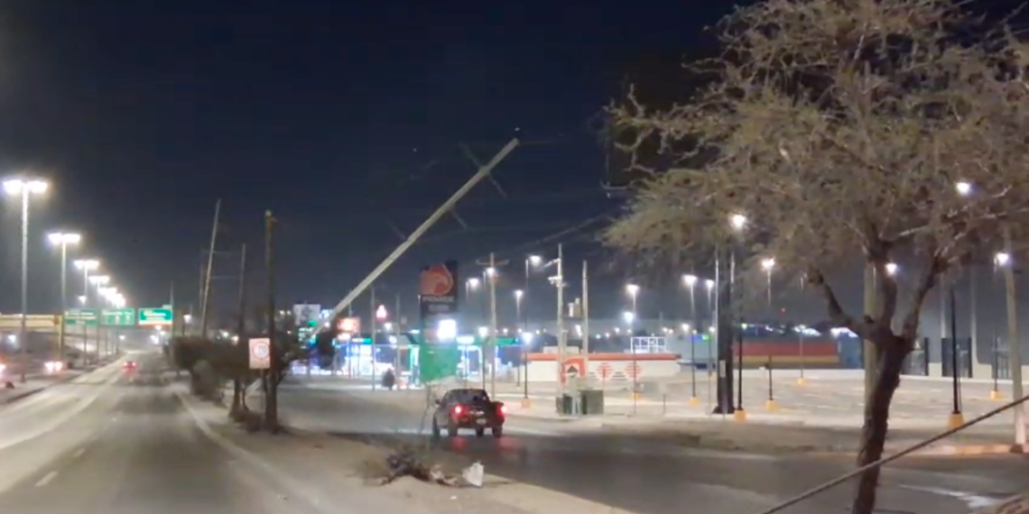 Ciudad Juárez, Chih.– Autoridades municipales investigan un incidente ocurrido en el cruce del Libramiento y Hermanos Soler, donde el operador de una grúa derribó dos postes y huyó del lugar.