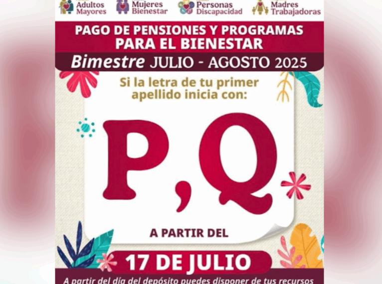 México — A través de un comunicado oficial, el Gobierno Federal informó que a partir de este jueves 17 de julio se encuentran disponibles los pagos correspondientes al bimestre julio-agosto del programa Bienestar, para los beneficiarios cuyo apellido paterno inicia con las letras P y Q.