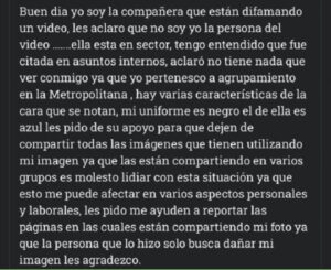 En su mensaje, la oficial pidió a la ciudadanía dejar de compartir imágenes falsas que la vinculan con el caso y reportar las páginas que las difunden, al considerar que dichas publicaciones afectan su reputación personal y laboral.