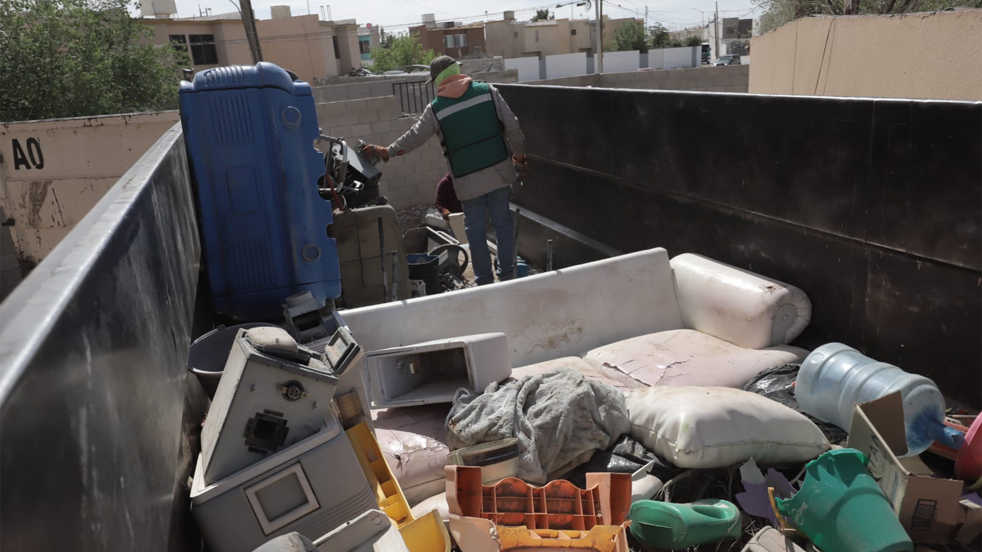 Ciudad Juárez, Chih.- El Gobierno Municipal, a través de la Dirección de Limpia, atendió la solicitud de vecinos del fraccionamiento Terranova, donde se logró retirar un estimado de 6 toneladas de artículos en desuso, principalmente colchones, durante un operativo realizado en tres zonas privadas.
