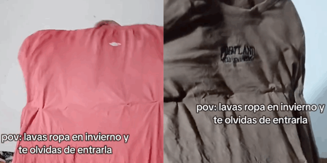 La usuaria Milagros (@miluu0_1) compartió un video donde se observa cómo varias prendas de ropa quedaron completamente rígidas luego de ser olvidadas al aire libre tras lavarlas. En el clip, que inicia con la frase “POV: lavas la ropa en invierno y te olvidas de entrarla”, se ve a los jóvenes mostrando camisetas, pijamas y otras prendas completamente congeladas.
