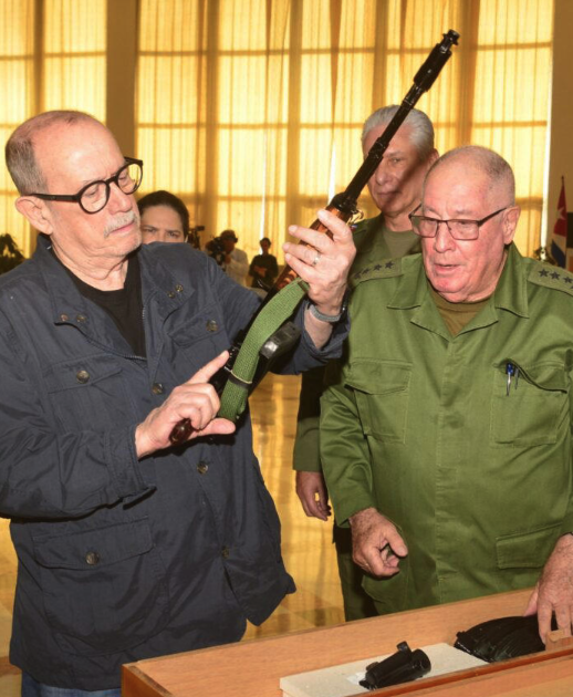 El arma fue entregada por el ministro de las Fuerzas Armadas Revolucionarias, Álvaro López Miera, quien destacó el compromiso del artista con la soberanía nacional. Según la información difundida, Rodríguez recibió tanto una réplica del fusil como un arma de combate.
