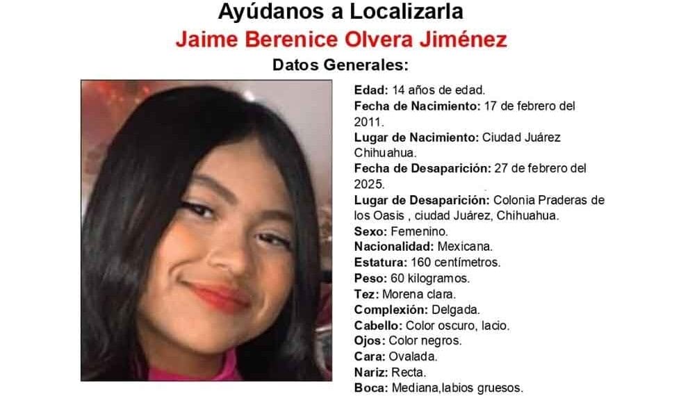 Ciudad Juárez.- La Fiscalía Especializada en Atención a Mujeres Víctimas del Delito por Razones de Género y a la Familia en la Zona Norte solicita el apoyo de la ciudadanía para localizar a Jaime Berenice Olvera Jiménez, de 14 años de edad.