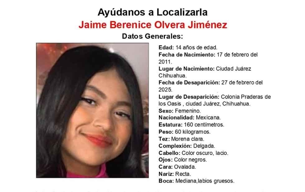 Ciudad Juárez.- La Fiscalía Especializada en Atención a Mujeres Víctimas del Delito por Razones de Género y a la Familia en la Zona Norte solicita el apoyo de la ciudadanía para localizar a Jaime Berenice Olvera Jiménez, de 14 años de edad.