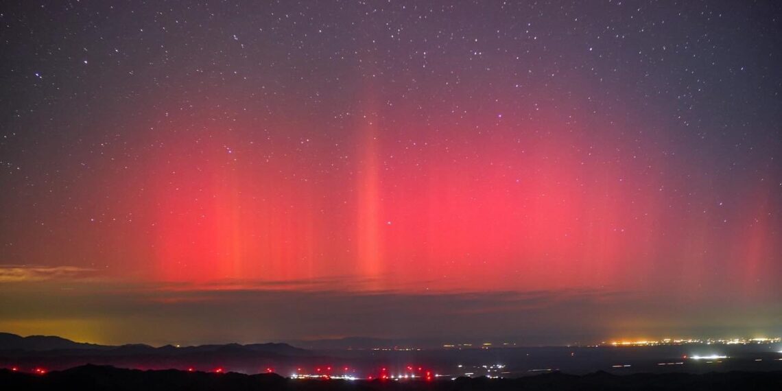 Líneas blancas verticales y un manto rosa con morado es visible desde La Rumorosa Baja California México tras la tormenta solar que impacta en estos momentos en el planeta tierra por segunda vez en el año este 2024. A lo lejos se pueden ver las luces de Mexicali Baja California y Calexico California.