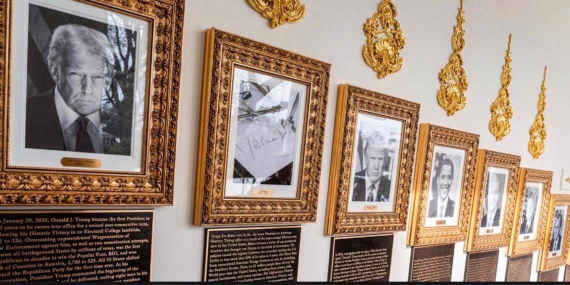 De acuerdo con reportes, Trump no solo modificó la tradicional galería de expresidentes que conduce a la Oficina Oval, sino que también instaló placas biográficas alteradas con afirmaciones ofensivas y teorías sin fundamento.