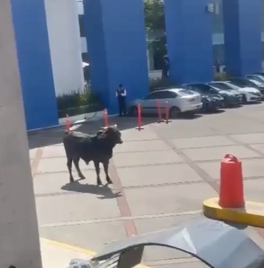 A través de redes sociales, se difundieron diversos videos en los que se observa al animal deambular por las áreas del estacionamiento, desorientado y nervioso, mientras trata de embestir a los guardias de seguridad.