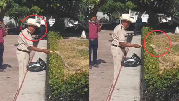 Adulto mayor alimenta a lagarto con tortilla y se vuelve viral en redes