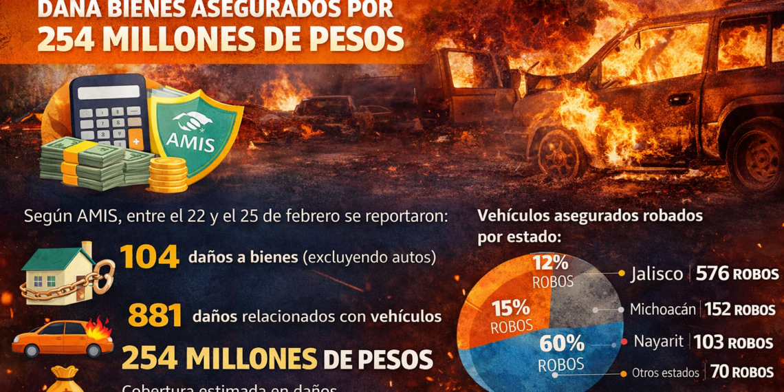 Ciudad de México, México.– La ola de violencia registrada tras el abatimiento de Rubén Oseguera Cervantes, líder del Cártel Jalisco Nueva Generación, generó siniestros por al menos 254 millones de pesos, de acuerdo con datos de la Asociación Mexicana de Instituciones de Seguros.
