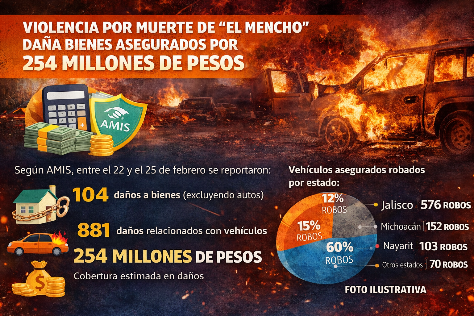 Ciudad de México, México.– La ola de violencia registrada tras el abatimiento de Rubén Oseguera Cervantes, líder del Cártel Jalisco Nueva Generación, generó siniestros por al menos 254 millones de pesos, de acuerdo con datos de la Asociación Mexicana de Instituciones de Seguros.